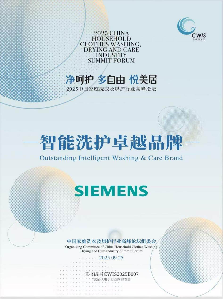 2025年9月25日,由中国家电网主办、中国家用电器协会指导的“2025中国家庭洗衣及烘护行业高峰论坛”在济南隆重举行。本次论坛以“净·呵护 多·自由 悦·美居”为主题,汇聚行业专家、企业领袖与媒体代表,共同探讨洗护行业发展趋势与技术创新。在备受瞩目的颁奖环节,博西家电旗下品牌西门子家电凭借其在智能洗护领域的卓越表现与创新实力,一举斩获三项殊荣:荣膺“2025中国家庭洗衣及烘护智能洗护卓越品牌”,西门子「包豪斯」洗烘套装获得“2025中国家庭洗衣及烘护高端智能净洗产品”奖,而西门子小晶钻奢护大师洗烘套装则荣获“2025中国家庭洗衣及烘护行业杰出渠道表现产品”奖,此外,博世6系活氧10KG洗烘套装也凭借其优异的市场表现与用户口碑,荣获“2025中国家庭洗衣及烘护行业杰出渠道表现产品”奖,彰显博西家电旗下双品牌协同发力,共同引领高端智能洗护市场的发展潮流。